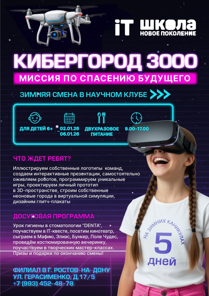 «КИБЕРГОРОД 3000: Миссия по спасению будущего» 📅 Со 2 по 6 января 2026 года 🌟 Это не просто лагерь, а погружение в киберпанк-мир будущего, где дети учатся работать в команде, мыслить креативно и осваивать современные технологии через игру, квесты и проекты. Каждый день — новое приключение, новые навыки и видимый результат 💡 📆 2–6 января 🕘 9:00–16:30 (приём детей до 10:00) 🍽 Включено двухразовое питание — обед и полдник 👩🏫 Дети под присмотром педагогов в течение всего дня 📅 Что ждёт ребят: 2 января — знакомство, командообразование, цифровое творчество и кино 🎬 3 января — английский в формате игры, кибер-квест, батутный парк, робототехника 🤖 4 января — дроны, эксперименты, квесты и создание кибер-костюмов 🚁 5 января — дизайн будущего, QR-миссии и фото-квест 📸 6 января — финальный проект, большой квест, кулинарный мастер-класс и праздничное шоу 🎉 🚀 Нажимайте «Записаться» Количество мест ограничено — забронируйте место заранее 🤍 📞 За подробной программой и консультац