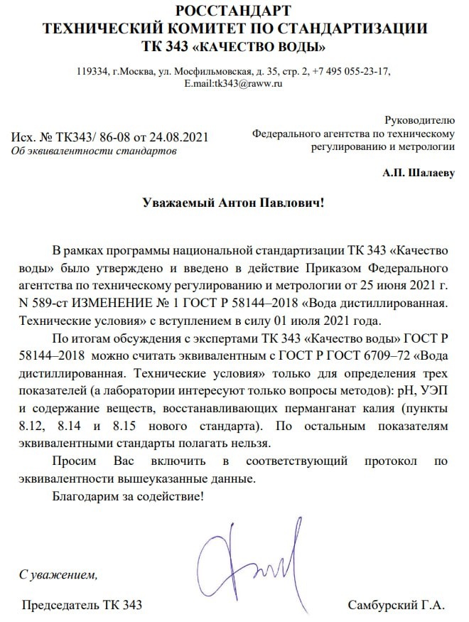 Эквивалентность ГОСТ 6709-72 и ГОСТ Р 58144-2018 установлена только для трёх показателей: рН, УЭП и содержание в-в, восстанавливающих