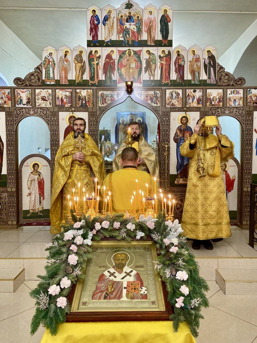 Николая, архиепископа Мир Ликийских, чудотворца, архимандрит Владимир (Дяченко) возглавил Божественную литургию в Введенском храме. Его Высокопреподобию сослужили клирики храма: иерея Михаила Войцешко и иеродиакон Николай (Плюснин). После чтения Святаго Евангелия, на сугубой ектении были возглашены особые прошения за Церковь, Патриарха, архиереев, духовенство, власть, о благочестивом воинстве и защитниках нашего Отечества, о плененных, о болящих, путешествующих, о нуждающихся, в скорбях, в узах, о восстановлении мира и всех православных христианах. За Божественной литургией вознесли молитву о Святой Руси. Архимандрит Владимир (Дяченко) по запричастном стихе произнёс слово проповеди. На отпусте настоятель поздравил верующих с праздником святителя Николая Чудотворца, поблагодарил приходской хор за молитвенное пение и на богомольцев в святом храме призвал Божие благословение. По завершении Литургии совершили молебен.