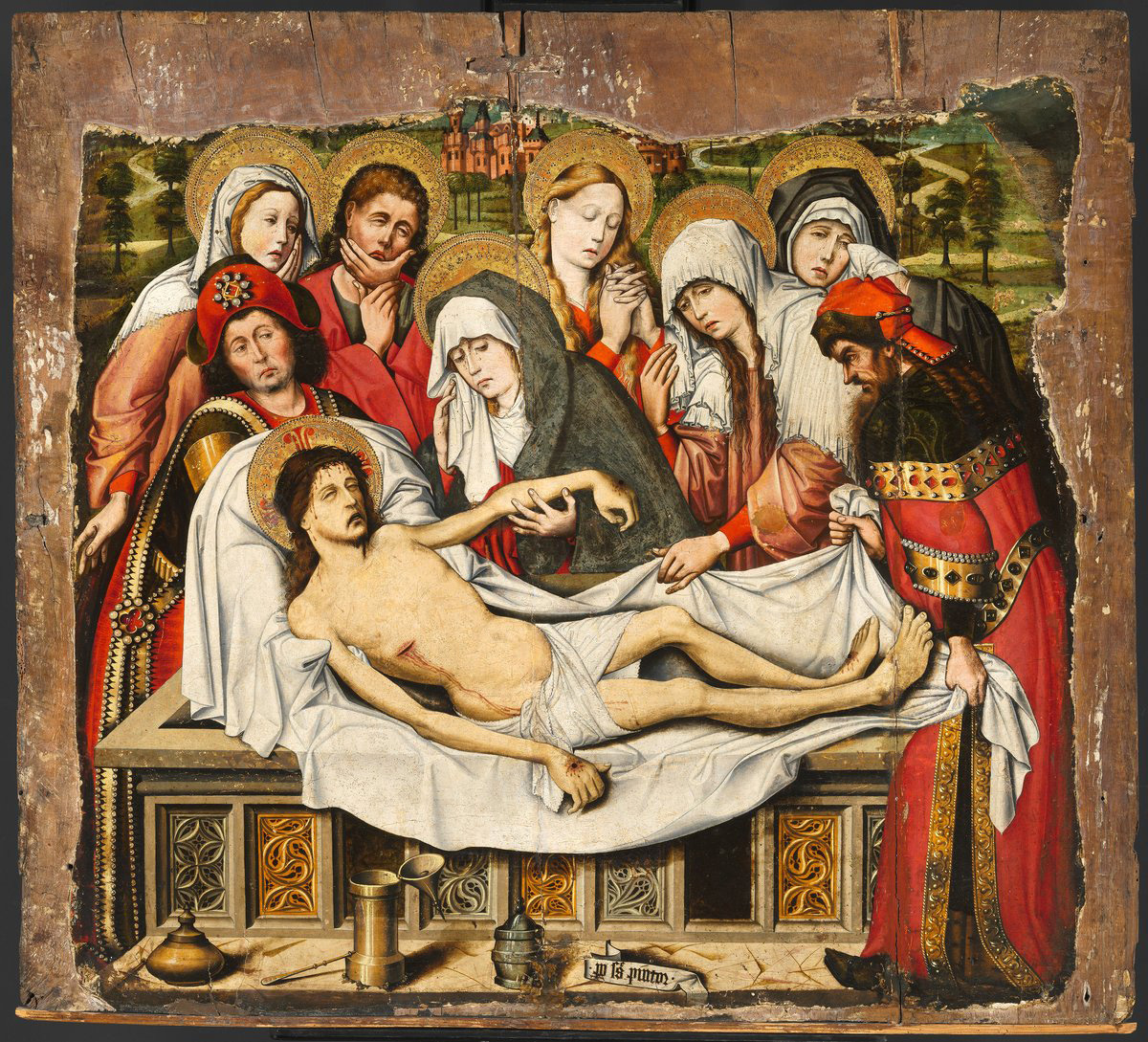 Торжественная, подавленная скорбь траура пронизывает эту сцену, изображающую последние мгновения перед тем, как Иосиф Аримафейский и Никодим запечатают тело Христа в каменном саркофаге. Эта гармоничная и тонко сбалансированная композиция выделяется ещё и тем, что художник – что довольно необычно для того времени – подписал свое имя на видимой на переднем плане баннерной ленте: po ses pintor. Извилистые дороги и детали пейзажа на заднем плане, симметричное расположение фигур и замысловатая работа с одеждой указывают на то, что Педро Санчес I был последователем ранней фламандской традиции живописи. Тем не менее, в его творчестве присутствует один элемент, который является исконно испанским: множество сосудов, расположенных перед саркофагом, разных форм и материалов, является ранним примером bodegon, типично испанской категории натюрморта. Картина была написана в конце 15 века. Её размер 82 × 90 см. P.S. Приглашаем вас посетить наш телеграмм-канал, там много всего интересно. А уж скольк