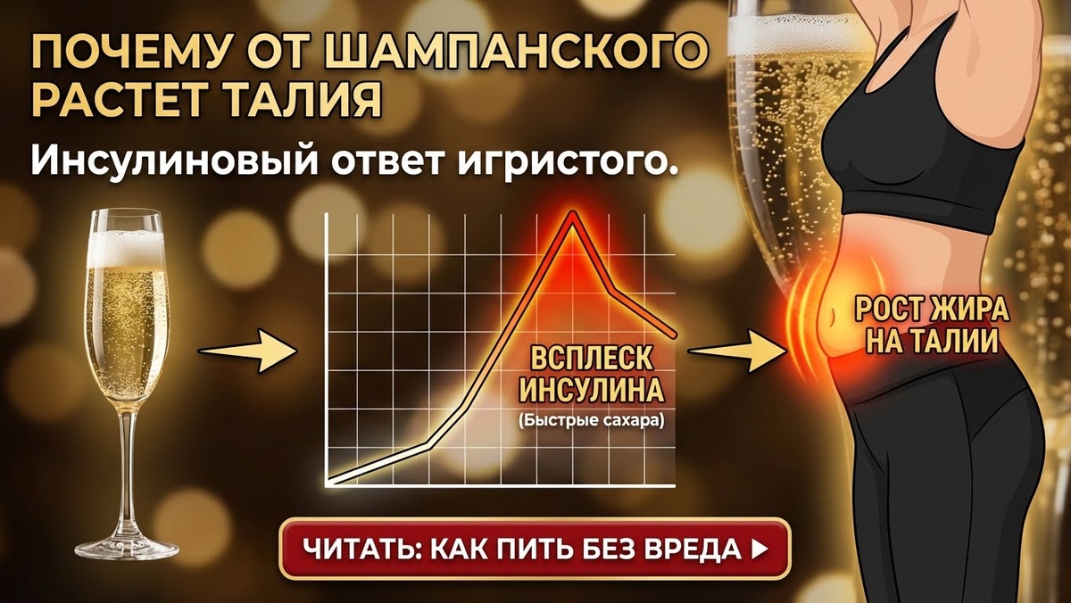 Новый год без шампанского — не Новый год. Мы привыкли считать его легким, праздничным напитком. «Ну что будет от пары бокалов? Это же не пиво и не жирный ликер». Но диетологи и эндокринологи знают печальную статистику: именно любители игристого чаще всего жалуются на рыхлость тела и «спасательный круг» на талии, который невозможно убрать в спортзале. Проблема не только в сахаре. Проблема в пузырьках.