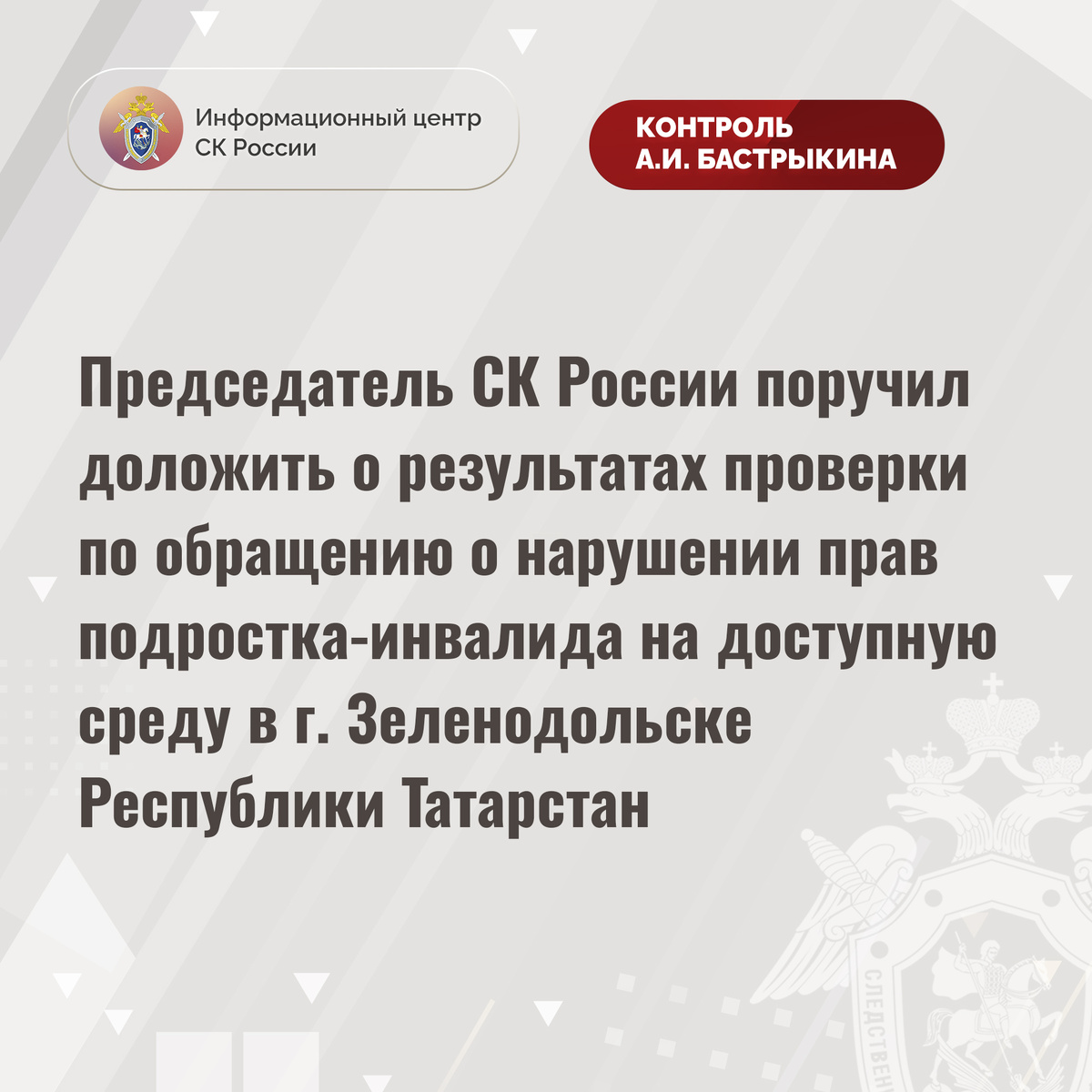Председатель СК России поручил доложить о результатах проверки по обращению о нарушении прав подростка-инвалида на доступную среду в г. Зеленодольске Республики Татарстан В приёмную Председателя СК России А.И. Бастрыкина обратилась жительница Республики Татарстан по вопросу нарушения прав ее 17-летнего сына, являющегося инвалидом-колясочником, на доступную среду. Семья проживает в многоквартирном доме на улице Загородной в городе Зеленодольске, лестничные марши и входная группа которого не оборудованы пандусами. В связи с этим мать вынуждена переносить подростка и техническое средство реабилитации на руках. Многочисленные обращения семьи в компетентные органы результатов не принесли, мер к предоставлению жилья взамен либо установке пандуса не принимается. В СУ СК России по Республике Татарстан по поступившему обращению организована процессуальная проверка. Председатель Следственного комитета Российской Федерации Александр Иванович Бастрыкин поручил руководителю СУ СК России по Республ