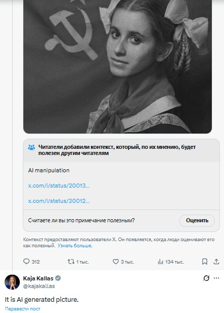 Кая Каллас сегодня в X начала опровергать фото из постов о её детстве в семье партийного номенклатурщика, прикрываясь расхожей фразой "AI generated picture". Кая, её пионерское прошлое - на 100% не ИИ — это общеизвестный факт. Ты была пионеркой, как и миллионы из нас. Посты были вообще не про фото. Он про реальность. Про правду. Пусть по-твоему — пусть это ИИ, пусть художественная картина, портрет маслом. Она всё равно будет правдой. Реконструкцией той правды, которую ты скрываешь, обвиняя других в манипуляциях. А в реальности манипуляция — твоя: попытка спрятать прошлое за словами про ИИ. Покажи свои школьные фото, Кая. Не прячь. С красным галстуком, бантами, октябрятской звёздочкой. У нас с тобой одно прошлое — разницы нет. Но я своё не скрываю и горжусь им. А ты прячешь. Галстук, присяга, идеи братства и справедливости — реальные. Мы все их носили и клялись. Вопрос не в фото. Вопрос в том, почему ты теперь отрицаешь то, чему клялась в детстве. Мы, советские пионеры, помним. Честное