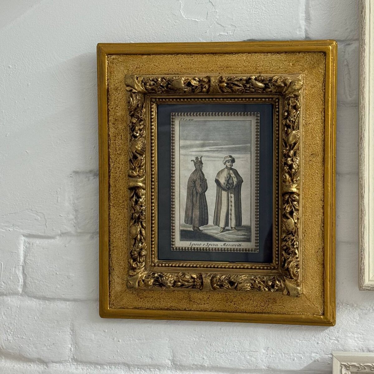 Salmon) — “Lo stato presente di tutti i paesi, e popoli del mondo naturale…”, вышедшем в 1738 году. Это одно из наиболее значимых европейских этнографических изданий XVIII века, включающее редкие изображения народов мира. Гравюра демонстрирует московского жениха и невесту в традиционных костюмах того времени. Изображение относится к серии этнографических иллюстраций и ценится за характерную точность и выразительность. Гравюра оформлена в антикварный деревянный багет первой половины XIX века, аккуратно отреставрированный с сохранением оригинальной фактуры. В оформлении использованы материалы музейного уровня: бархатное паспарту глубокого матового тона; дополнительный деревянный кант, подчеркивающий архитектуру композиции; профессиональные архивные материалы для долговременного хранения. Узнать подробнее и купить можно прямо сейчас по ссылке