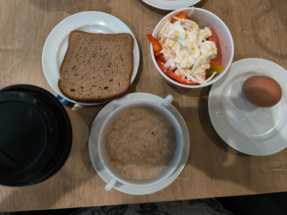Домой даже не стала заходить, поехали в "Глобус" получать скидку на день рождения. Сначала зашли позавтракать. У меня ложка салата с майонезом (есть не стала, отвыкла от майонеза, еда с ним кажется очень жирной), а в чашке овощи. Каша на воде с манго. Хлеб. Варёное яйцо и чай с лимоном и мятой.