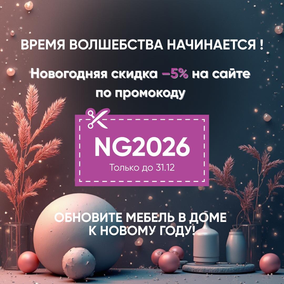 Запускаем новый промокод NG2026 — с хорошей, заметной скидкой. 🎄 –5% на заказ по промокоду NG2026 Акция действует до 31.12.2025. Как это работает, всё просто: 1️⃣ Регистрируетесь на сайте vsyamebel.shop с промокодом NG2026 2️⃣ Выбираете мебель для дома — диван, кровать, кухню, шкаф, стол, матрас или что давно планировали 3️⃣ Оформляете заказ от 100 000 ₽ 4️⃣ Получаете скидку 5% Это хороший вариант, если вы как раз планировали крупную покупку к Новому году — скидка ощутимая и без каких-то сложных условий. 💡 Важный момент про оплату: Промокод NG2026 действует только при полной онлайн-оплате на сайте. При оплате при получении действует обычная цена. 👉 И да, промокод VM1111SHOP на –3% никуда не пропадает — он сохраняется. Теперь можно выбрать, какой вариант вам выгоднее: — –3% на заказы от 50 000 ₽ — или –5% по новому новогоднему промокоду NG2026 на заказы от 100 000 ₽ Если нужна помощь с выбором мебели, подбором комплектаций или расчётом — мы всегда на связи и с радостью поможем