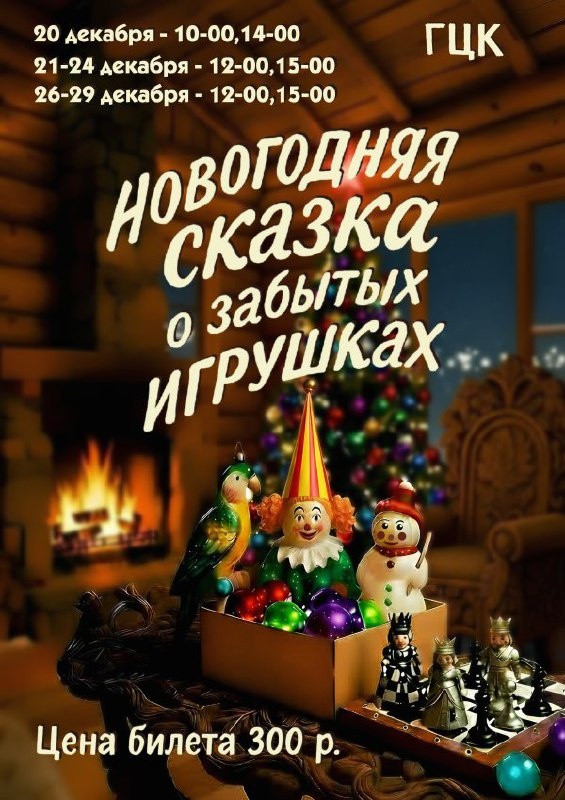 ? Представляем вам нашу новогоднюю премьеру — спектакль «Сказка о забытых игрушках» ❄️✨ Это больше, чем просто история. Это напоминание о том, как важно ценить друзей, верить в чудеса и хранить теплые воспоминания. История, от которой у детей загорятся глаза, а взрослые украдкой смахнут скупую слезинку. Сможем ли мы все вместе спасти Новый год? Приходите поболеть за отважных «Спасателей Нового Года»! Вас ждёт море смеха, чудес и удивительных открытий. 📅 Даты: 20, 21-24, 26-29 декабря. ⏰ Время: 10:00, 12:00, 14:00, 15:00 (уточняйте по датам в афише). 💵 Стоимость билета: 300 руб. 🏛 Где: Городской центр культуры (билеты в кассе). ☎️ Телефон для справок: 3-00-66 Подарите себе и детям настоящую зимнюю сказку! #Афиша_ГЦК