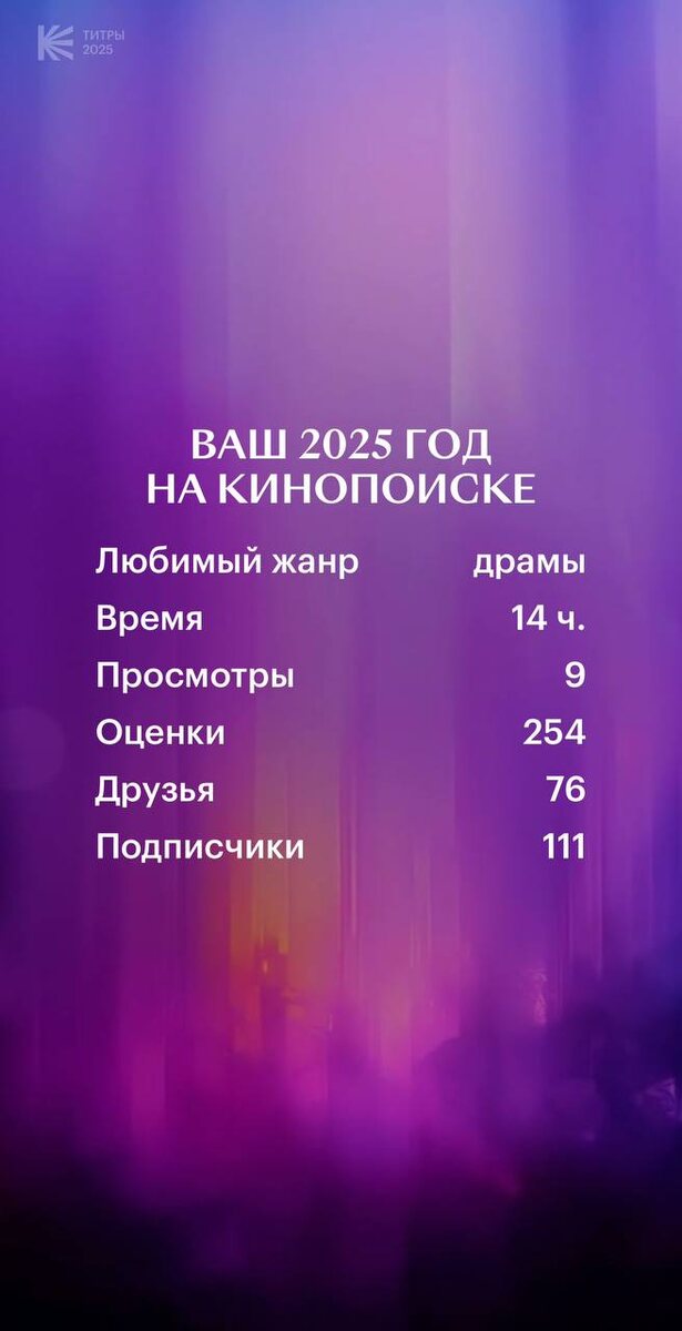 В приложении или на сайте ф ищите Титры и делайте открытия 😹 У меня каждый год ужасно смешные цифры по просмотрам, потому что я, как вы понимаете, смотрю все не в онлайн-кинотеатре, а в просмотровках и на фестивалях 🙈 Но в этом году я посмотрела целых 9 проектов! В прошлом было 5 😹 Как видите, досматривала «Камбэк» и «Метод» без водяных знаков. Ивану Соснину я бы поставила 10, но хотелось бы чуть ровнее ритм! Единичку поэтому скинула (с этой прозрачностью теперь всегда придется отвечать за базар 🙈) Героиня моего жанра Ольга Сутулова выпала и случайно (Ольга отвечает в Титрах за драму), и не случайно: именно с нею мы делили столик на премии АПКиТ ❤️ Ну, и постер года. Что тут скажешь 🙈 Алиса AI суммаризировала, спасибо ей, как говорится 😹 Делитесь скорее своими постерами в комментариях!