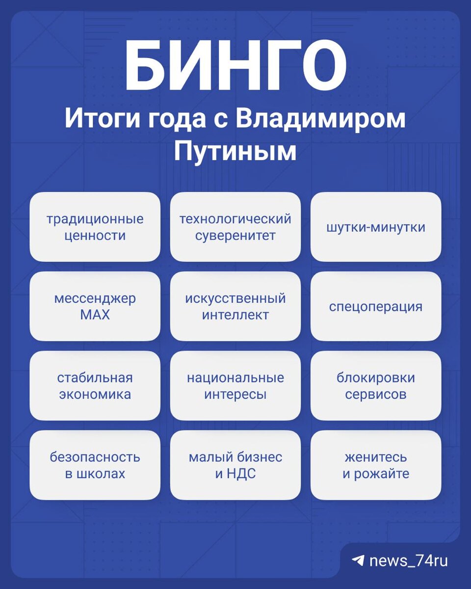 Прямая линия с Владимиром Путиным начинается По традиции запускаем бинго с темами, которые, скорее всего, сегодня озвучат. Потом проверим. ▶️ Прямой эфир можно смотреть здесь.