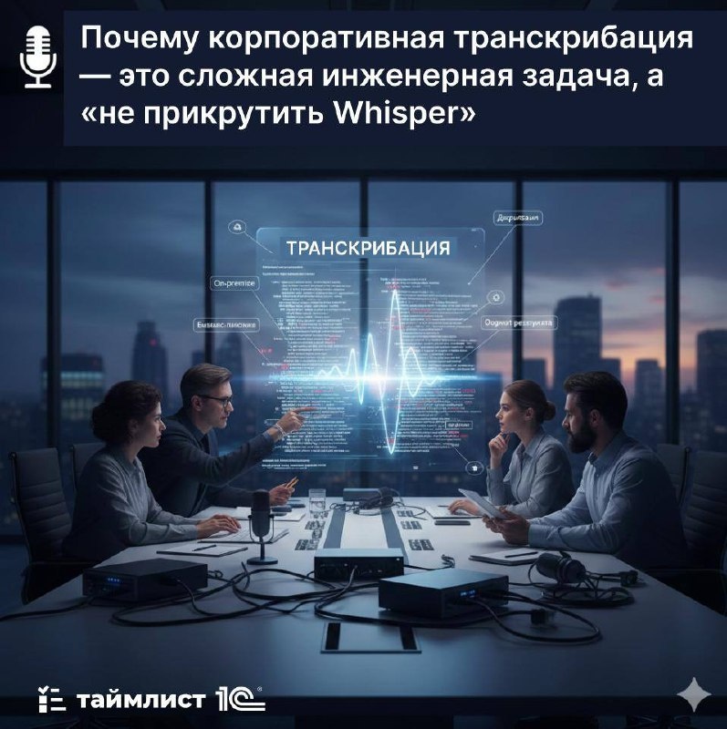 » Со стороны кажется, что расшифровка встреч давно решена: загрузил запись совещания — получил текст. Но в корпоративной среде всё работает иначе. Конфиденциальные данные нельзя отправлять в публичные сервисы, встречи проходят в шумных переговорках, участники говорят одновременно, используют внутренние термины и сокращения, а итоговый результат должен подходить для протоколов, отчётов и дальнейшей работы. В Таймлист мы прошли этот путь на практике и быстро поняли: качественная транскрибация — это не одна «умная модель», а целая инженерная система. С какими сложностями мы столкнулись в реальных проектах: 💙 Безопасность и инфраструктура. Во многих компаниях решения должны работать внутри корпоративного контура, без передачи данных наружу, и при этом укладываться в ограничения по ресурсам. 💙 Качество аудио. Офисные шумы, эхо, несколько микрофонов, гибридные встречи — всё это сильно снижает точность без дополнительной обработки звука. 💙 Корпоративная лексика. Названия проектов, проду