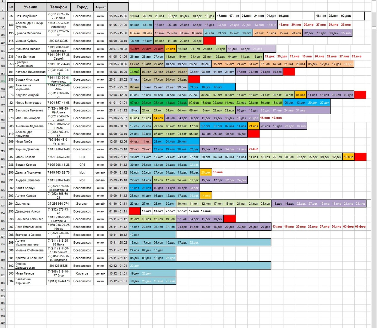 С завтрашнего дня у меня начинается плотный график выступлений, поэтому администрированием заниматься времени не будет. Высылаю итоговую сверку до конца года. Просьба особенно внимательно сверить наши с вами записи на предмет соответствия графику, оплатам абонемента и т.д. Для вашего удобства выписал отдельно все запланированные в графике даты.