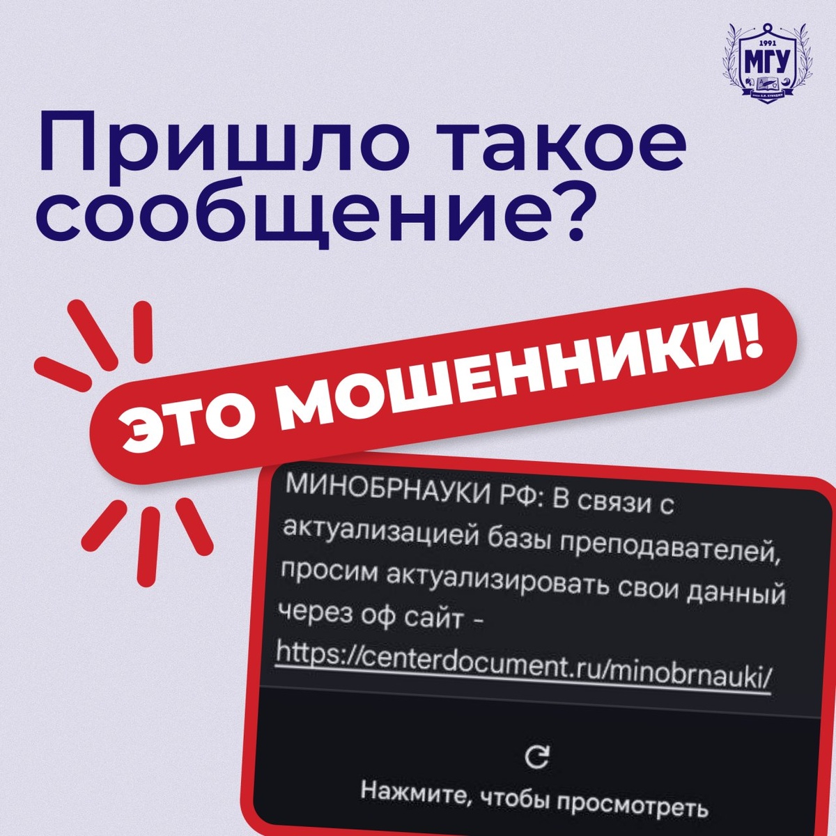 ! 🔴 В последнее время участились случаи рассылки сообщений и телефонных звонков, поступающих от имени Минобрнауки России с просьбами «обновить данные», перейти по ссылке или сообщить персональную информацию. ❗️Минобрнауки России не рассылает подобные сообщения и не запрашивает персональные данные через SMS, мессенджеры или телефонные звонки. Подобные действия осуществляют мошенники! ❌ Не переходите по подозрительным ссылкам, не передавайте данные и сразу блокируйте такие номера. Будьте бдительны и предупредите коллег и близких! 👻 MAX|💙ВК|📝Дзен|🤩Сайт #МГУимениКуинджи