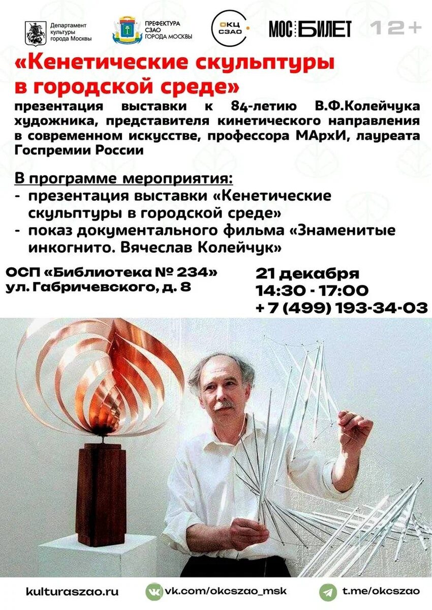 «Кинетические скульптуры в городской среде» 🗓 21 декабря 2025 года 🕒 14:30 – 17:00 📍 Адрес: ул. Габричевского, д. 8 21 декабря в 14:30 в библиотеке № 234 состоится презентация выставки «Кинетические скульптуры в городской среде», посвящённая 84-летию Вячеслава Фомича Колейчука — художника, представителя кинетического направления в современном искусстве, профессора МАрхИ, лауреата Государственной премии России. Вячеслав Фомич Колейчук (1941–2018) — один из пионеров кинетического искусства в России. Он работал на стыке разных видов искусств, создавая самонапряжённые и «самовозводящиеся» конструкции, вантово-стержневые структуры, невозможные фигуры и самоколлажи, штриховые стереографии, световые инсталляции, звучащие объекты, а также знаменитую «гравицапу» для фильма «Кин-дза-дза!». В 1967 году, в возрасте 26 лет, Колейчук реализовал один из самых дерзких проектов — 13-метровую вращающуюся и звучащую кинетическую композицию «Атом», установленную перед зданием Института атомной энер