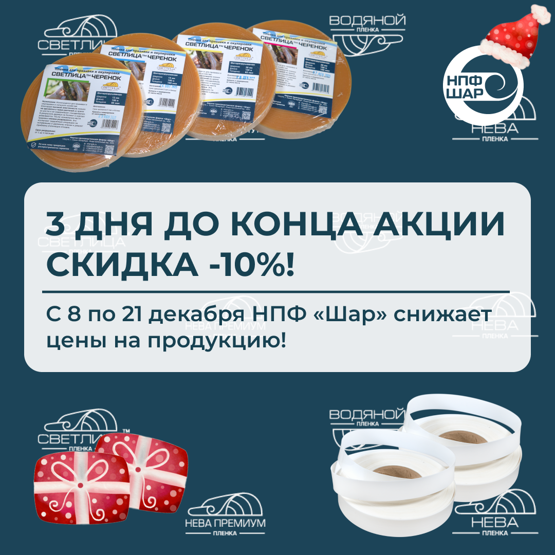 С 8 по 21 декабря НПФ «Шар» снижает цены на всю продукцию на 10%! Условия Новогодней акции: 🔹 Акция распространяется на оптовый и розничный прайс-лист; 🔹 Действие акции не распространяется на однолетнюю полиэтиленовую, техническую и силосную пленки; 🔹 Скидка 10% не суммируется с другими скидками. 📌 Наш сайт: https://clck.ru/3QukYP