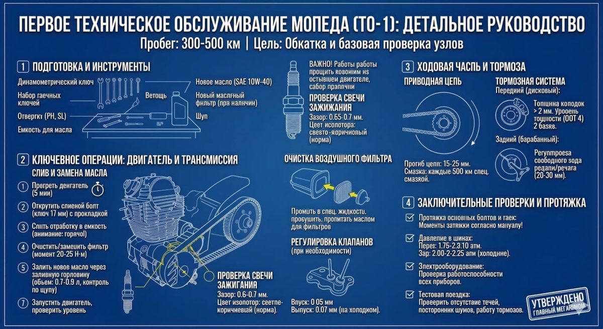 🛵🛠 Купили новый мопед и уже откатали первые несколько сотен километров? Поздравляем с обкаткой! Но расслабляться рано — пришло время для ТО-1 (Первого Технического Обслуживания). Многие новички недооценивают этот этап, а зря. ТО-1 на пробеге 300–500 км — это критически важная процедура. Именно в этот период происходит активная притирка деталей двигателя и коробки, а в масле скапливается «обкаточная стружка». Проигнорировать ТО-1 — значит существенно сократить ресурс техники. Чтобы вы ничего не упустили и сделали всё правильно, мы подготовили детальную инфографику-руководство. Это настоящая карта действий для вашего гаража. Что внутри шпаргалки: 🧰 Подготовка: Полный список необходимых инструментов и расходников (не забудьте про правильное масло!). ⚙️ Сердце мопеда: Пошаговая инструкция по замене масла, очистке фильтров и проверке свечи. Обратите внимание на регулировку клапанов — на этом пробеге она часто необходима. ⛓️ Ходовая и тормоза: Как правильно натянуть цепь и убедиться
