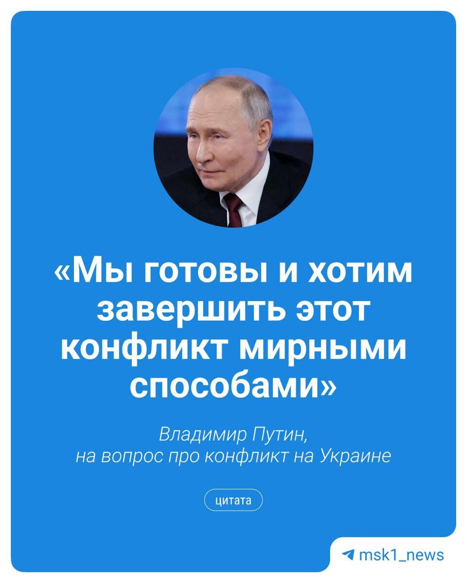 Путин — о конфликте с Украиной 🟥 Москва пока не видит готовности Украины к миру. «Мы готовы и хотим завершить этот конфликт мирными способами на основе принципов, которые были изложены мной в прошлом году», — говорит Путин. 🟥 Стратегическая инициатива полностью перешла в руки ВС РФ, войска наступают по всем направлениям, противник отходит, добавил президент.