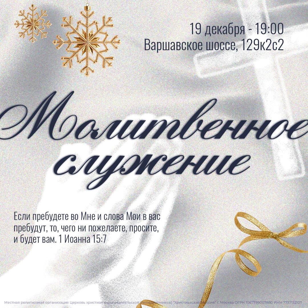 🙏 19 декабря / 19:00 / Варшавское шоссе, 129к2с2, 5 этаж, офис 501 Это время, когда мы как церковь соединяемся в молитве, поклоняемся нашему Господу, благодарим за всё, что Он делает, и приносим Ему свои нужды с верой и надеждой. «Взывай ко Мне, и Я отвечу тебе, покажу тебе великое и недоступное, чего ты не знаешь.» (Иеремия 33:3) Верим, что Бог силён отвечать на каждую молитву! ❤️