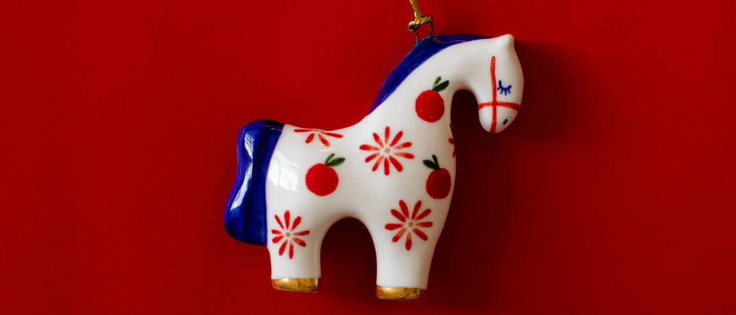 Настоящую удалую тройку лошадок — с апельсинами, васильками и в полоску — мы нашли в петербургской мастерской Zorca Ceramica. Каждая фигурка сделана из полуфарфора и расписана вручную мастерицами бренда. Игрушки продаются и в комплекте, и по отдельности, так что можно собрать собственный табун с лошадками и украсить им ёлку или интерьер.