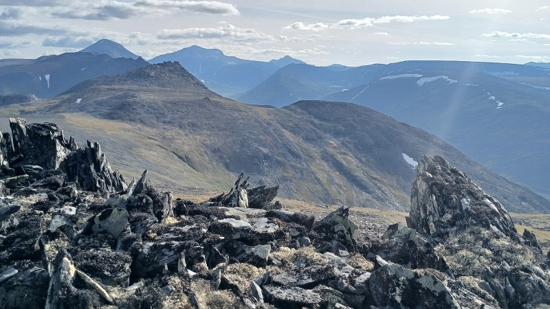 Бодренько пропрыгали по камням через реку Балбань Ю и начали затяжной подьем к склону хребта. Обнаружили, что тропы тут тоже есть, но это тропы оленеводов и оленей. По куруму темп движения сильно упал (еще из-за черники и морошки.) Но в запасе у нас 3 дня, так, что можно особо не спешить. Заросли стланика серьезно так подбешивают, кстати говоря…