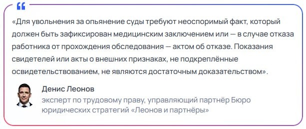 ? На портале «Рамблер/Карьера» вышла статья «Могут уволить за похмелье или только за пьянство: разбираем юридические тонкости». В ней я делаю акцент на том, как важно разграничивать опьянение и похмельный синдром (абстиненцию). Если в предыдущем посте речь шла об увольнениях работников с доказанными признаками опьянения, то ситуация с абстиненцией юридически сложнее. Трудовое законодательство разграничивает состояния опьянения и абстиненции. Само по себе плохое самочувствие, остаточный запах алкоголя или внешний вид при отрицательных показаниях алкотестера не образуют оснований для увольнения по пп. «б» п. 6 ч. 1 ст. 81 ТК РФ. При отсутствии объективных доказательств опьянения такой приказ с высокой вероятностью будет отменен судом. В статье разобраны случаи, когда похмелье может привести к увольнению. Например, если работник не вышел на работу из-за похмелья, ситуация может квалифицироваться как прогул без уважительных причин. Если же он явился, но допустил ошибки или сорвал рабочий п