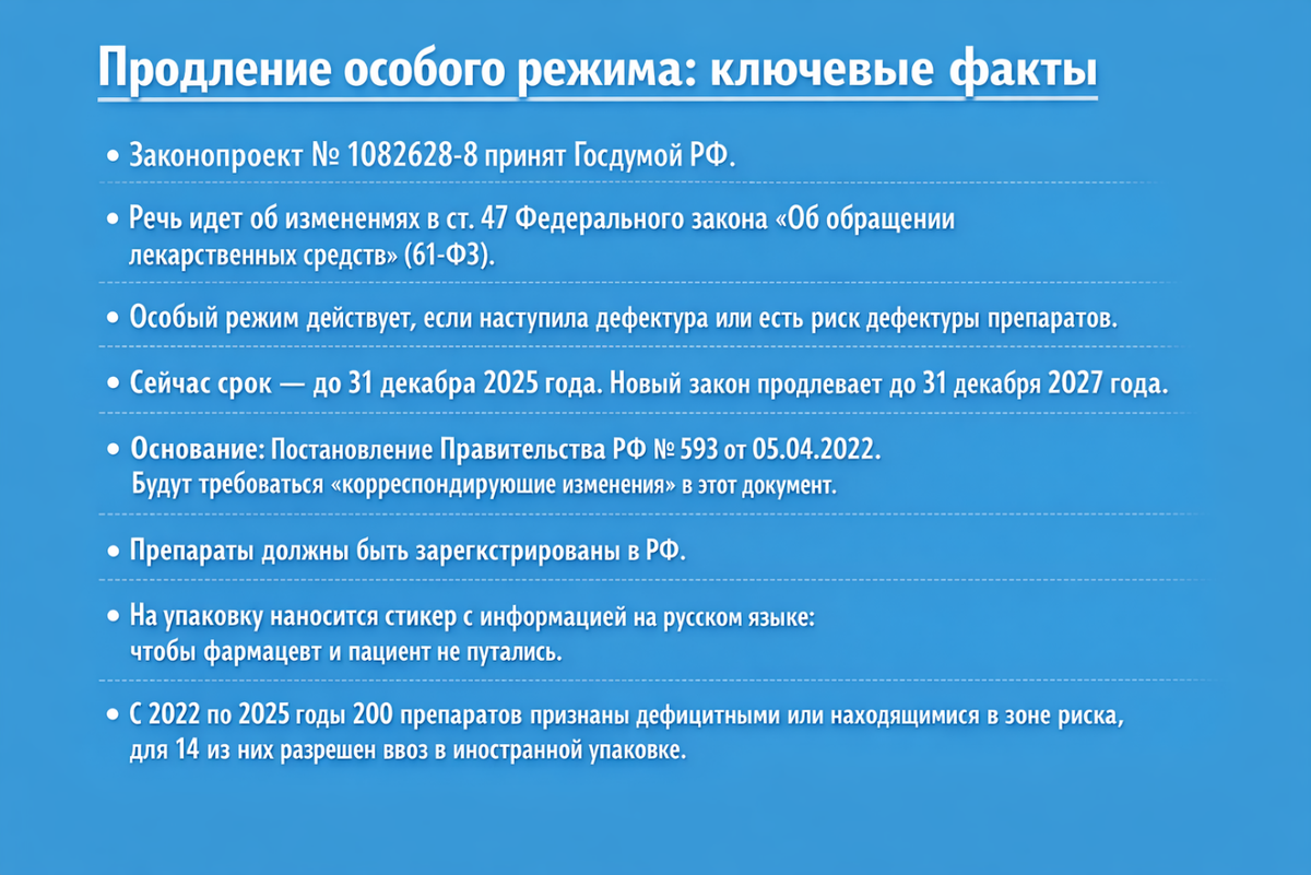 С 2022 года в России действует особый порядок: если есть проблемы с импортом лекарств (дефектура или её риск), можно ввозить зарегистрированные препараты в иностранной упаковке — главное, чтобы на ней была русскоязычная наклейка с нужной информацией. До последнего времени этот режим был временный: конец — 31 декабря 2025 года. Госдума утвердила законопроект, продлевающий срок до 31 декабря 2027 года. Инициатива — реакция на санкции, перебои в поставках и риски для пациентов, которым нужны качественные, доступные лекарства здесь и сейчас. Почему вам важно не потерять из виду эту новость? Всё просто: дело не только в очередной редакции Федерального закона № 61-ФЗ. За каждым таким применением «особого режима» стоит конкретная аптека, закупщик, врач — и конкретные люди, которые не должны остаться без лечения. Разбираем, как будет работать новый порядок, что с маркировкой, какие риски, и к чему готовиться владельцам аптек и частных медклиник. С 2022 года этим занимается межведомственная ко