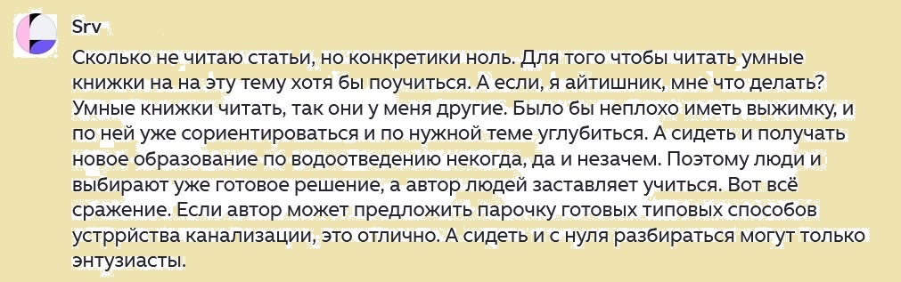 Специалисты по информационным технологиям, которые обслуживают и ремонтируют компьютеры и цифровые сети, оказывают техническую поддержку, пишут программы и создают сайты - и не разбираются в каких-то там септиках? Или не хотят разобраться? Вот тут один заходил на канал Шефа и высказался достаточно откровенно: Я сидела и долго думала... как по мне, так гораздо сложнее разобраться во всей этой айтишной зауми, нежели в устройстве автономной канализации загородных домов. Тем более, что вся информация есть. И даже краткую выжимку Шеф делал, вот она: И если что непонятно, то спросить Шефа можно вот здесь: И даже не обязательно там, можно в комментариях к любой статье спросить, Шеф обычно оперативно и доброжелательно отвечает, если ему не грубить и он видит заинтересованность вопрошающего. А потом я поняла, вернее нашла ключевые слова - некогда и незачем разбираться, дайте готовое на блюдечке. И желательно безДвозДмезДДо, то есть ДаДом, как говорила Сова в старом советском мультике: Где лежит
