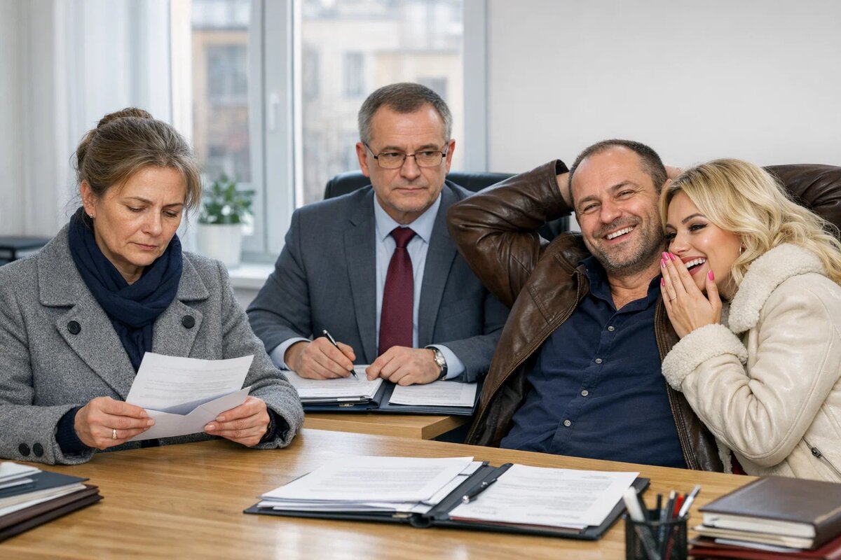 Тишина упала так резко, что стало слышно, как за окном шуршит дождь. Виктор замер с документами в руках, улыбка медленно сползала с лица. Анжела перестала хихикать, смотрела на нотариуса, потом на Марину, и в глазах её мелькнул испуг.