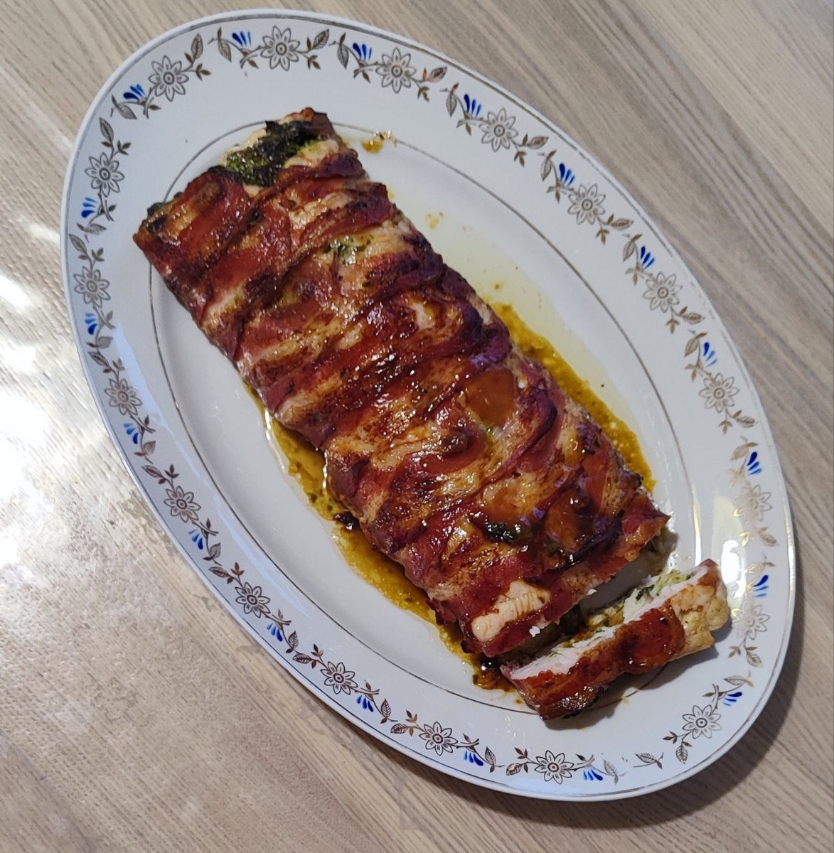 А я уже репетирую блюда для новогоднего стола. Это рулет из куринной грудки в беконе с начинкой из шпината, творожным сыром и курагой.