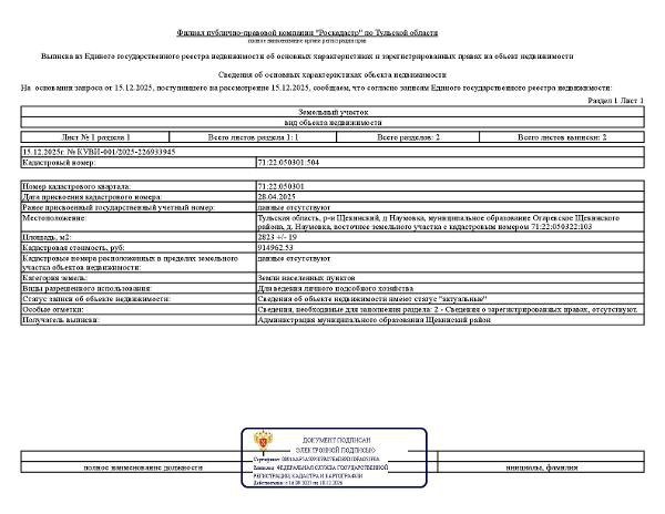 , площадью 2823 кв.м, расположенного по адресу: Тульская область, р-н Щекинский, д Наумовка, муниципальное образование Огаревское Щекинского района, д. Наумовка, восточнее земельного участка с кадастровым номером 71:22:050322:103 Канал: Госземля Тульская область Область: обл Тульская Район: м.р-н Щекинский Населенный пункт: с.п. Огаревское, д Наумовка Локация: Смотреть на карте ВРИ: Для ведения личного подсобного хозяйства (приусадебный земельный участок) Кадастровый номер: 71:22:050301:504 Кадастровая стоимость: - Вид сделки: Аренда Площадь: 2823 м² Начальная цена: - руб. Дата завершения: 18.01.2026 Подробнее: ГИС ТОРГИ #госземля #земляотгосударства #земля #земельныйучасток #земельныеторги #торги #аукцион #арендаземли #аренда #тульскаяобласть