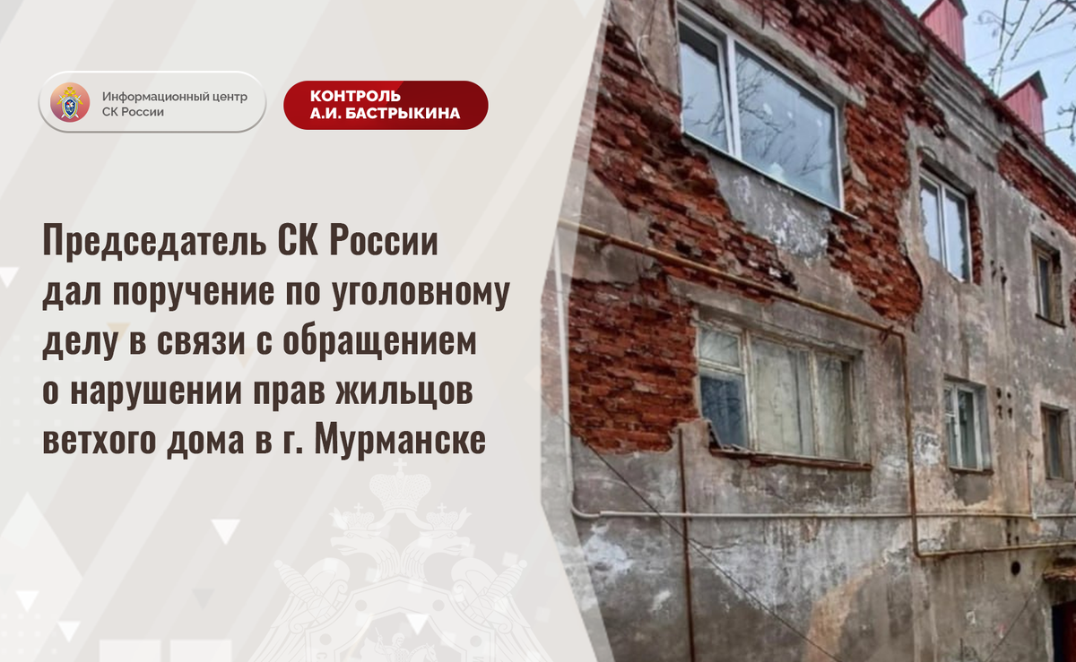 Председатель СК России дал поручение по уголовному делу в связи с обращением о нарушении прав жильцов ветхого дома в г. Мурманске В комментариях в аккаунте Информационного центра СК России «ВКонтакте» размещено обращение по вопросу продолжающегося нарушения прав жильцов многоквартирного дома на улице Лесной города Мурманска. Здание 1962 года постройки находится в непригодном состоянии: разрушается кирпичная кладка стен, падающие элементы которой представляют опасность для прохожих, в помещениях образовалась сырость. Многочисленные обращения граждан в компетентные органы результатов не принесли, мер к признанию строения аварийным либо к проведению капитального ремонта не принимается. Ранее указанная ситуация освещалась в социальной сети. В СУ СК России по Мурманской области расследуется уголовное дело, по которому ранее А.И. Бастрыкин поручал представить доклад. Председатель Следственного комитета Российской Федерации Александр Иванович Бастрыкин поручил руководителю СУ СК России по Му