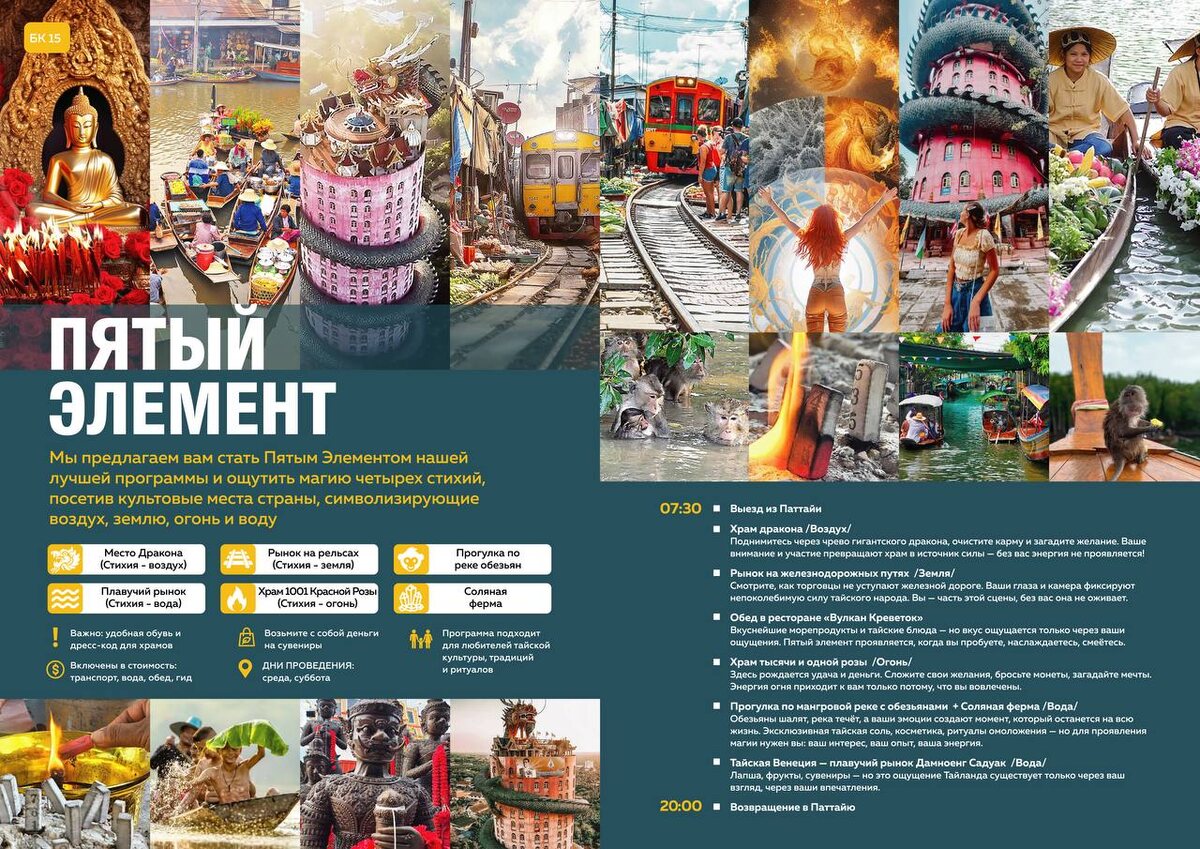 Вы увидите Таиланд, каким его знают сами тайцы — не открытки, а живую магию страны. 🐉 Гигантского дракона, обвивающего 80-метровый храм. Вы пройдёте внутри его тела, поднимаясь вверх по спирали, увидите 16 уровней храма, алтари, символы, а наверху — панораму, от которой захватывает дух. 🚂 Рынок на железнодорожных путях, где прямо перед вами медленно пройдёт поезд, а торговцы в считанные секунды свернут прилавки и снова разложат товар. Редкие кадры, которые невозможно повторить. 🌹 Тысячи алых роз, свечи, огонь и ритуалы. Вы увидите, как воск открывает цифры удачи, услышите мантры, почувствуете тепло живого огня и атмосферу настоящей тайской веры. 🐒 Реку с обезьянами, где мангровые заросли отражаются в воде, а мартышки подплывают к лодке, смотрят в глаза и создают ощущение живого, доброго хаоса. 🚤 Плавучий рынок, лодки с дымящейся лапшой, фруктами и сладостями, узкие каналы, улыбки продавцов, ощущение, что вы попали в Таиланд XIX века. 🧂 Соляные поля, белоснежные кристаллы по