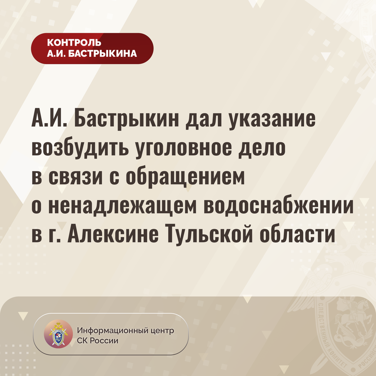 А.И. Бастрыкин дал указание возбудить уголовное дело в связи с обращением о ненадлежащем водоснабжении в г. Алексине Тульской области В комментариях в аккаунте приёмной Председателя СК России А.И. Бастрыкина в социальной сети «ВКонтакте» опубликовано обращение жителя города Алексина Тульской области по вопросу ненадлежащего водоснабжения в микрорайоне Соцгород. Длительное время в жилые помещения граждан поступает жизненно необходимый коммунальный ресурс, непригодный для потребления и бытовых нужд ввиду наличия примесей. Несмотря на имеющиеся нарушения, мер к модернизации инженерных сетей не принимается. Обращения в различные инстанции результатов не принесли. Ранее указанная ситуация освещалась в сети Интернет. Председатель Следственного комитета Российской Федерации Александр Иванович Бастрыкин дал указание руководителю СУ СК России по Тульской области Владимиру Владимировичу Усову возбудить уголовное дело и представить доклад о ходе и результатах его расследования. Исполнение поруче
