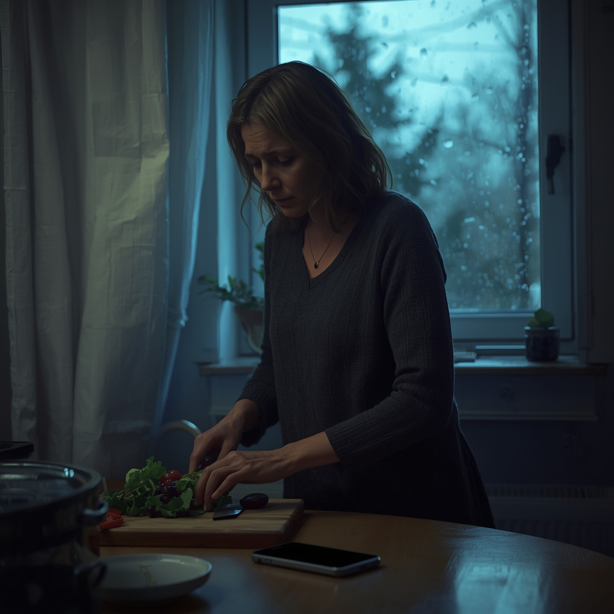 Стояла на кухне и резала овощи для салата. Нож скользил по огурцам, помидоры падали в миску. Всё как обычно. Телефон лежал рядом на столе. Звонка от мамы не было уже три дня. Раньше она звонила каждый день. Спрашивала, как дела, что готовлю на ужин, как на работе. А теперь тишина.