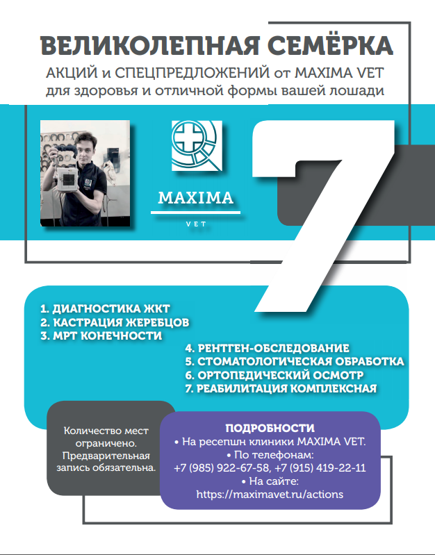 1- ДИАГНОСТИКА ЖКТ за 50 тысяч. Потому что 80% современных лошадей страдают гастритом. 2- КАСТРАЦИЯ ЖЕРЕБЦОВ: комплексное предложение за 40 тысяч. Для удобства коневладельцев и спокойствия животных. ПЛЮС СПЕЦИАЛЬНЫЕ УСЛОВИЯ – со СКИДКОЙ 30%. 3- МРТ КОНЕЧНОСТИ лошади за 55 тысяч. Чтобы верно определить причину хромоты и не дать лошади «доломаться». 4- РЕНТГЕН-ОБСЛЕДОВАНИЕ лошади со скидкой 63%. Снимки спины, шеи и конечностей. 5- СТОМАТОЛОГИЧЕСКАЯ ОБРАБОТКА по выгодной цене. Здоровые зубы — основа отличного самочувствия и работоспособности лошади. 6- ОРТОПЕДИЧЕСКИЙ ОСМОТР со скидкой 50%. Многие патологии можно выявить и скорректировать на ранних стадиях. 7- РЕАБИЛИТАЦИЯ КОМПЛЕКСНАЯ со скидкой 30%. Грамотное восстановление лошади важно для результативных тренировок и успешной работы. ВЕЛИКОЛЕПНАЯ СЕМЕРКА АКЦИЙ для здоровья и отличной формы вашей лошади в MAXIMA VET: КОЛИЧЕСТВО МЕСТ ОГРАНИЧЕНО. Предложение действует до 1 мая 2026 года, только на территории MAXIMA VET! Подробности уточняйт