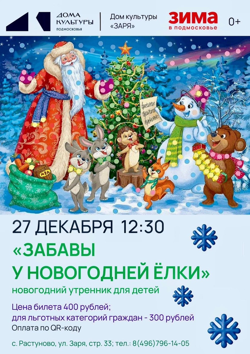 ✨ 🎄 ДЕТСКИЙ НОВОГОДНИЙ УТРЕННИК 🎄 Сельский Дом культуры «Заря» приглашает девчонок и мальчишек на новогодний утренник «ЗАБАВЫ У НОВОГОДНЕЙ ЁЛКИ» (для детей от 3-х до 5 лет) Цена билета 400 рублей; для льготных категорий граждан - 300 рублей. Оплата по QR-коду в день мероприятия. Ждём вас в нашем гостеприимном Доме культуры «Заря»! 💫 С НАМИ НЕ СОСКУЧИШЬСЯ! 🚫 Возраст: 0+ 📆 27.12.2025🕒12:30 🏢 Сельский дом культуры (СДК) «Заря» 📍 г.о.Домодедово, с.Растуново, ул.Заря, д.33 💰 Цена от 300 ₽ ✅ Мероприятия Домодедово https://dzen.ru/id/66f10385cc4c5a16f7b5fb02 http://vk.com/domodedovo_events http://dzen.ru/domodedovo_events