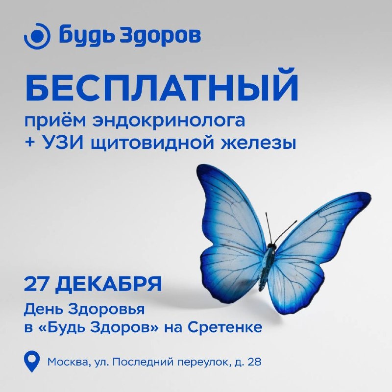В преддверии Нового года мы чаще всего желаем друг другу одного — здоровья. Чтобы помочь нашим пациентам заботиться о себе осознанно, на базе клиники «Будь Здоров» на Сретенке стартуют «Дни здоровья», когда приемы высококвалифицированных врачей и диагностика становятся бесплатными для всех! 27 декабря врачи клиники проведут первый День здоровья, посвящённый диагностике и профилактике заболеваний щитовидной железы. Все посетители клиники смогут: ✅ получить бесплатную консультацию врача-эндокринолога ✅ бесплатно сдать анализ на ТТГ ✅ пройти бесплатно УЗИ щитовидной железы ✅ задать вопросы специалистам и получить рекомендации из первых рук Для записи пишите в личные сообщения группы "Будь Здоров" в телеграме и воспользуйтесь промокодом DENZDRAV, тогда прием, анализ и УЗИ будут абсолютно бесплатны. Ссылка — https://t.me/Klinika_Bud_Zdorov Такие Дни здоровья будут проводиться в клинике регулярно, подпишитесь, чтобы не пропустить! 📍 Москва, ул. Последний переулок, д. 28 🤝 Будь здоро
