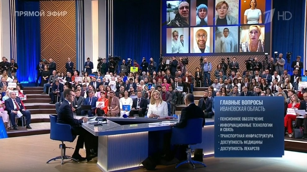 В этом году большинство вопросов от жителей Ивановской области поступило на следующие темы: - пенсионное обеспечение; - информационные технологии и связь; - транспортная инфраструктура; - доступность медицины; - доступность лекарств. Фото: скрин прямого эфира «Первого канала»