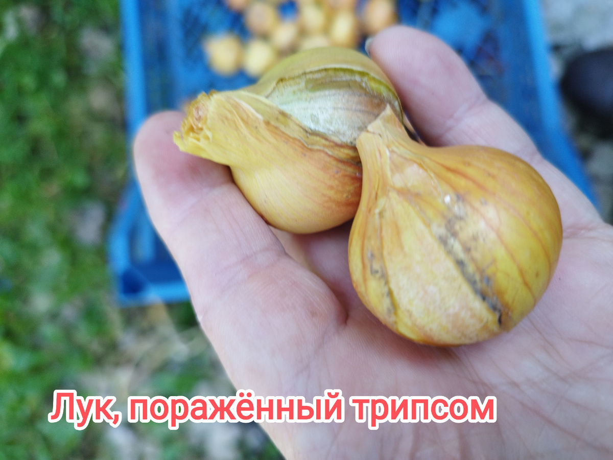 Очень часто лук бывает поражён трипсом. Первый признак- треснувшая чешуя.