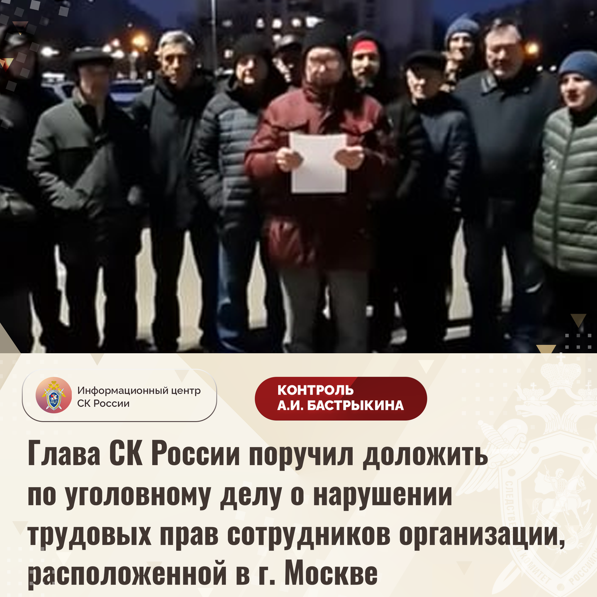 Глава СК России поручил доложить по уголовному делу о нарушении трудовых прав сотрудников организации, расположенной в г. Москве В СМИ размещено видеообращение к Председателю СК России А.И. Бастрыкину бывших работников ООО «Интек» по вопросу несогласия с ходом установления обстоятельств нарушения их трудовых прав. Длительное время граждане осуществляли трудовую деятельность в компании, однако заработная плата свыше шести месяцев им не выплачена, окончательный расчет в день увольнения не произведен. Обращения пострадавших в компетентные органы результатов не принесли, до настоящего времени мер к погашению образовавшейся задолженности не принимается. В ГСУ СК России по городу Москве возбуждено уголовное дело. Председатель Следственного комитета Российской Федерации Александр Иванович Бастрыкин поручил руководителю ГСУ СК России по городу Москве Дмитрию Владимировичу Беляеву доложить о ходе и результатах расследования уголовного дела. Исполнение поручения поставлено на контроль в централ