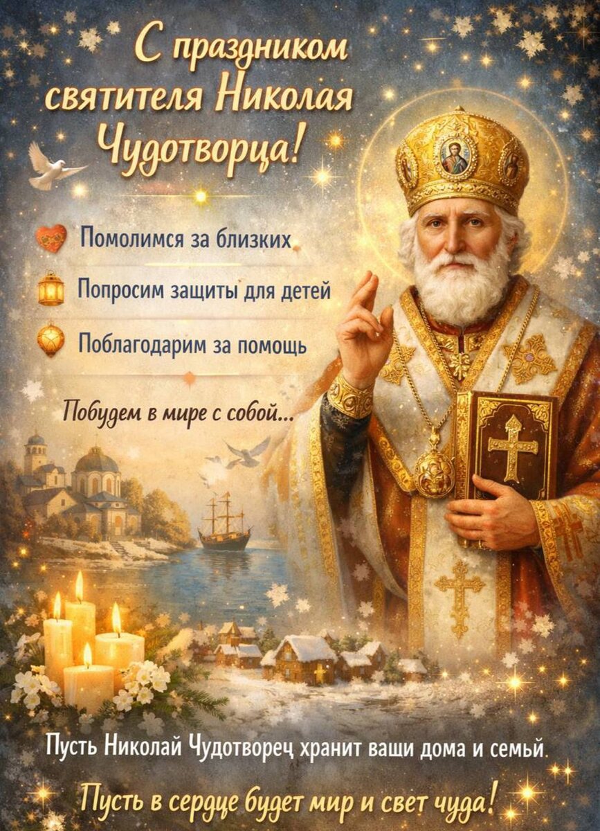 ✨ Сегодня день особого света и тихой радости. День святителя Николая — покровителя детей, путешественников, семей и всех, кто нуждается в помощи и защите 🤍 Николай Чудотворец — святой, к которому обращаются в самые трудные моменты. Когда не хватает сил. Когда тревожно за близких. Когда нужна поддержка, защита и надежда. Говорят, что он особенно быстро откликается на искреннюю, простую молитву, и помогает тихо, без шума — так, что потом понимаешь: чудо уже произошло. 🙏 В этот день хорошо: — помолиться за здоровье близких — попросить защиты для детей — поблагодарить за уже полученную помощь — и просто побыть в мире с собой Пусть святитель Николай хранит ваши дома, семьи и сердца. Пусть путь будет ровным, а душа — спокойной ✨ С праздником 🌲 , Ваш врач фитотерапевт Татьяна Владимировна Плесовских. ❄️❄️ Канал о пользе трав. Подписаться.