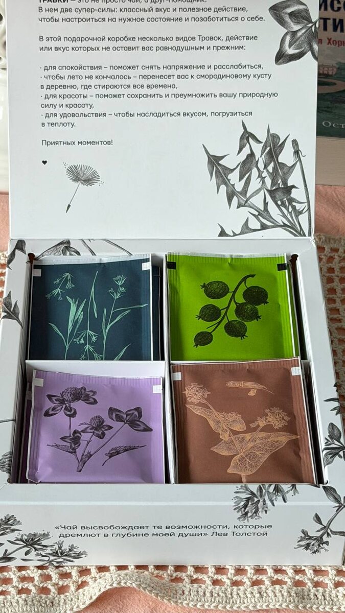 У чайного проекта ‘Травки’ целый набор пития для любого времени года (вы только посмотрите на составы трав!). А к приближающимся праздникам у ребят вышли подарочные боксы. Можно посмотреть вот здесь на одном из маркетплейсов. С баночкой меда — идеально для сувенира в тайном санте, собираюсь вручать всем своим наставникам и преподавателям в моем бесконечном количестве хобби-дел. А вообще это мои любимые чаинки в маленькие и гранд поездки. И для глубокого сна, и для случая нарушения режима питания, и для светлого мышления. Иногда этот пакетик с чаем хранится между страницами книг, уж слишком хорош этот принт гербария.