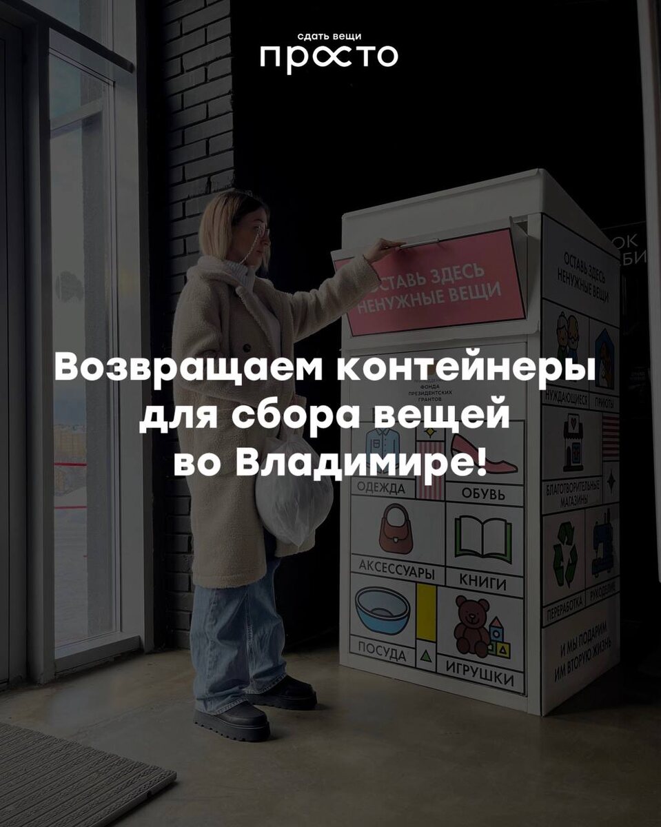 ! Мы возвращаем контейнеры для сбора ненужных вещей во Владимире. Уже на следующей неделе сбор вещей в контейнеры, ориентировочно, будет возобновлён по следующим адресам: ▫️ТЦ «Меридиан» — ул. Растопчина, 24А ▫️ТЦ «Черёмушки» —проспект Строителей, 9 ▫️Рынок на Студёной — Дворянская ул., 27А ▫️ПВЗ Ozon — село Богослово, ул. Нагорная, 2 ▫️ПВЗ Ozon и Wildberries — д. Зелени, ул. Светлая, 2 ▫️ПВЗ Ozon — Нижняя Дуброва, 36, рынок Слобода ▫️Ивановские мануфактуры — ул. Добросельская, 191В 📌 О точных датах и графике установки контейнеров сообщим дополнительно. Пожалуйста, следите за новостями, чтобы не пропустить актуальную информацию. Спасибо, что поддерживаете осознанное потребление и даёте вещам вторую жизнь 🤍