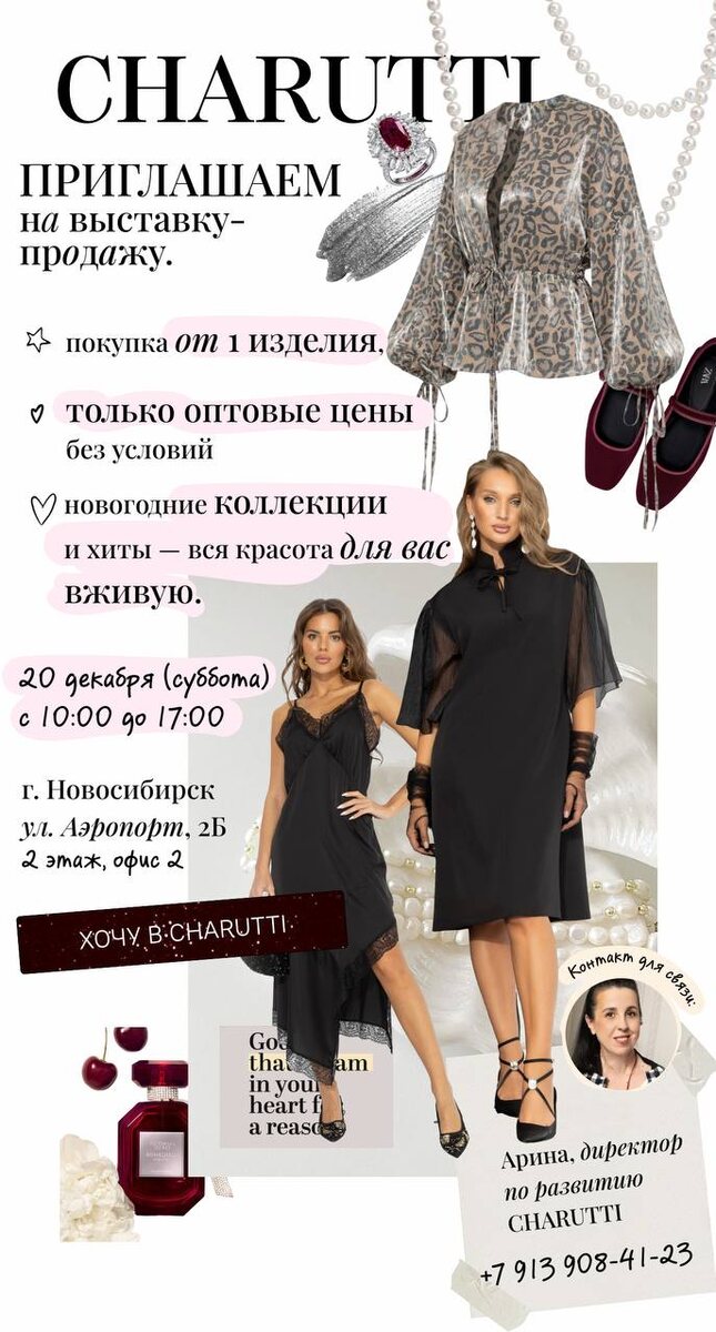 📅 Только один день – 20 декабря 2025 (СБ) 📍 Где: Новосибирск, ул. Аэропорт, 2Б, 2 этаж ⏰ Когда: с 10:00 до 17:00. Что вас ждёт: ▪️Новинки сезона и хиты CHARUTTI. ▪️Размеры от 44 до 54. ▪️Атмосфера вдохновения, примерок и «вау, как сидит!». ▪️И главное – оптовые цены для розничных покупок 😍 Это тот самый день, когда гардероб обновляется легко, красиво и с ощущением праздника 🌟 🔄 Регистрация обязательна: 👉 https://docs.google.com/forms/d/e/1FAIpQLSc8Vdg8EMaO3Fbip81orjYpLUXXzU1wN129W1wkYo7VNN_8aw/viewform?usp=header 📞 Есть вопросы? Арина всё подскажет: 8 913 908 41 23 🩷 Ждём вас 💛 Будет модно. Будет выгодно. Будет CHARUTTI.