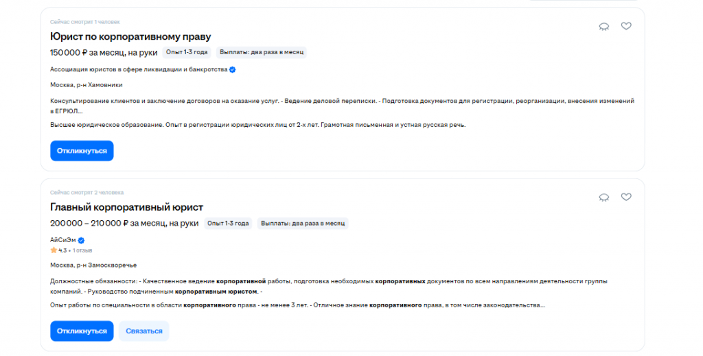 Кстати, многие крупные юридические компании не выставляют свои вакансии на агрегаторах типа HeadHunter, наиболее актуальный список вакансий у них на сайтах. И там зарплата значительно выше, тк это консалтинг.