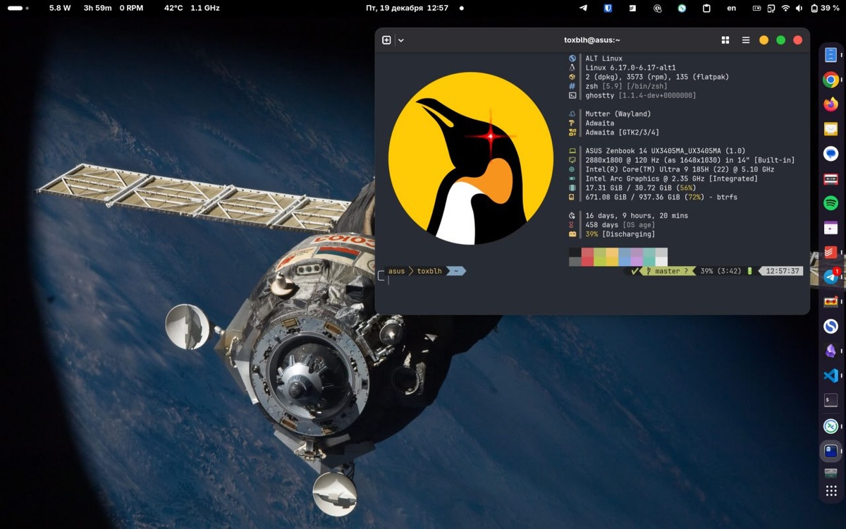 Что за зверь? ASUS UX3405MA, с сенсорным (так вышло) 14" OLED экраном, Intel Arc GPU и Intel Ultra 9 185H CPU, 32GB памяти. Ноут, как ноут - всем устраивает, после доработки напильником. Купил его ещё в марте 24 года. Попробовал на нём Ubuntu/Fedora/Alt, в итоге осел на Альт. За лето медленно перекатывался с стационара и смотрел по проблемам, устраивает ли он меня. Сначала это был звук был даже пост, что звук полностью завёл в Альт, GPU исправляли драйвера так же в Альт хаками, чтобы убрать артефакт "шахматы" которые были во всех дистрах и наконец полностью завели CPU, чтобы спал сладко и не тратил энергии, если вам тоже надо это самотесты Intel и AMD для выявления проблем. Более того даже завёл Numpad в тачпаде, с подсветкой, но в итоге отказался, так как не пользуюсь им. В целом ноут ни чем не отличается от винды по опыту использования. Систему последний раз установил в сентябре, после всех доработок начисто, это Alt Gnome Regular и она работает уже больше года с мелкими нареканиям