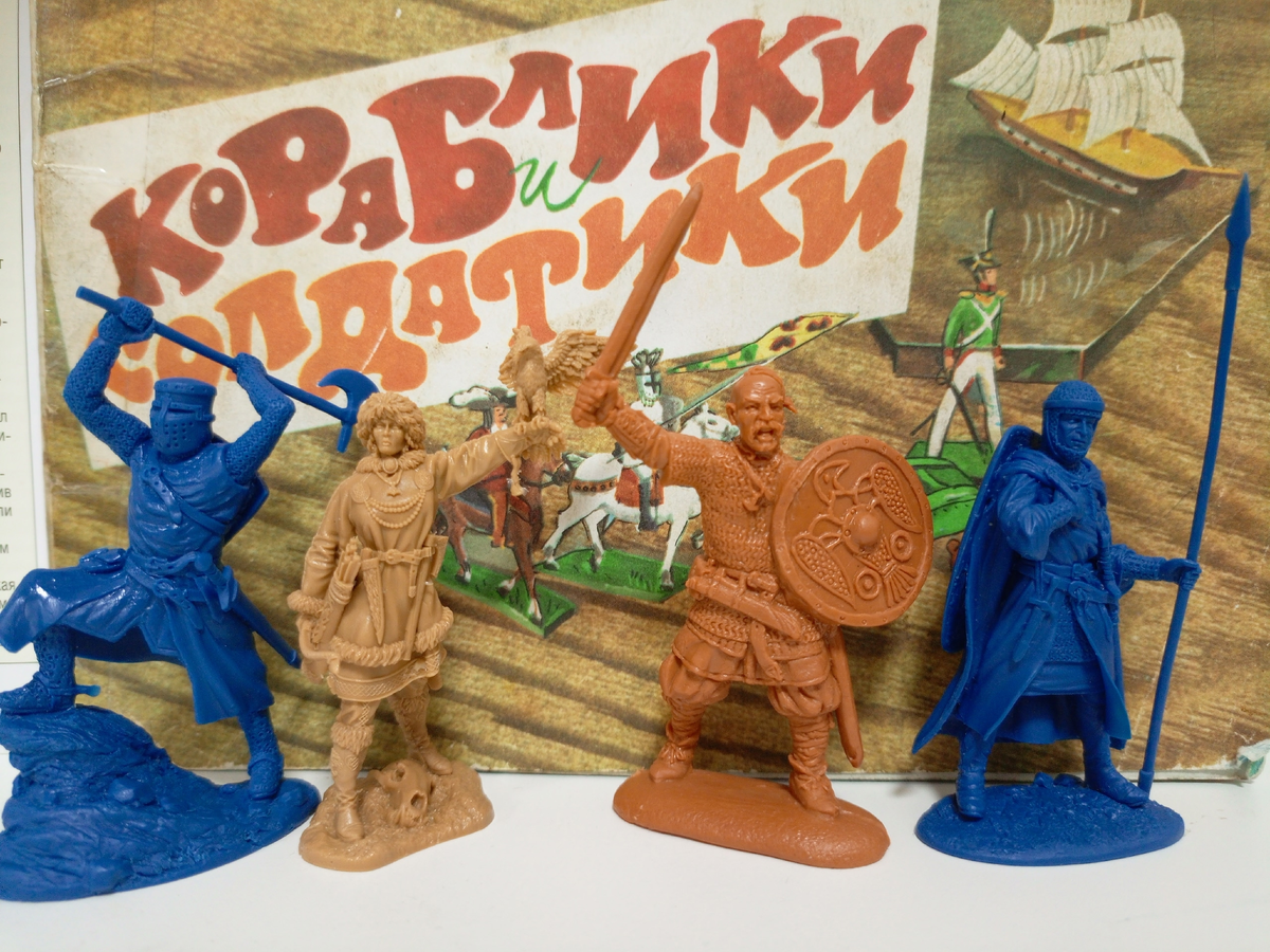 Четвертый, это рыцарь в охранение из набора "Крестоносцы √1" от производителя "Belerian toys soldiers" материал Резинопластик, поэтому копьё болтается, опасается чего, чтобы доказать что не опасается бьёт себя в грудь, сжимая ремень от щита. На нём кольчужная рубаха с длинными рукавами и капюшоном перехваченный обручом. На плечах висит плащ скреплённый верёвкой. На нем сюрко с рукавами. Подпоясан кожаным ремнём на котором кинжал в ножнах, на отдельном ремне меч в ножнах. На ногах чулки. Обут в сапоги. Левой рукой держит длинное копьё ~2,5 метра. За спиной каплевидный щит с умбоном. На подставке клеймо производителя в виде коринфского шлема. Детализированные и индивидуальные солдатики. У Евгения был ко мне вопрос какой материал самый лучший, если для полки- все подходят, если для игры термопласт и полителен наше все. Всем спасибо за внимание. Фото Монах Тук, Киндер Технолог, Прогресс СССР, Италери из Китая.