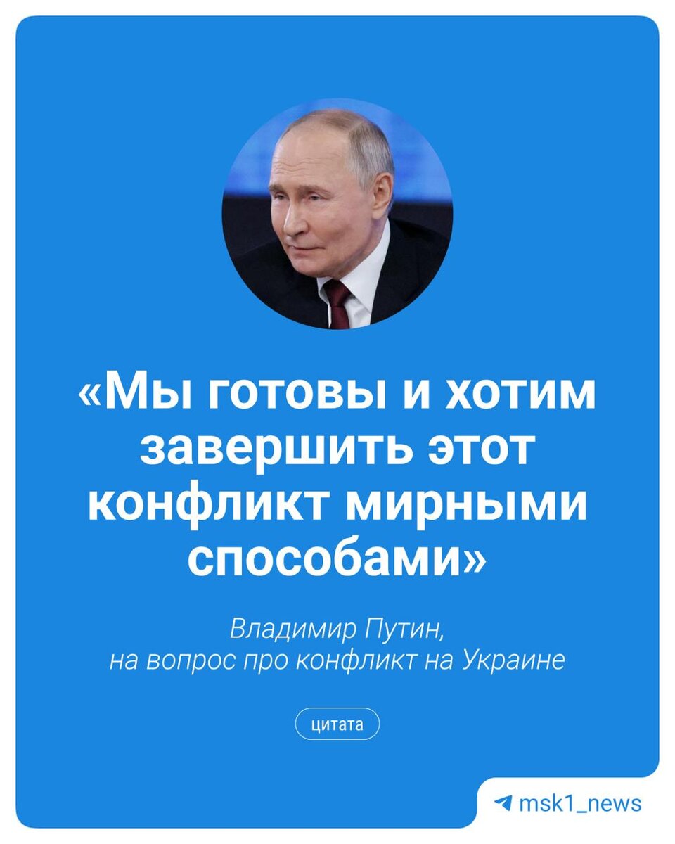 По словам президента, Россия пока не видит готовности Украины к миру: Мы готовы и хотим завершить этот конфликт мирными способами на основе принципов, которые были изложены мной в прошлом году. Основные моменты речи Путина по спецоперации.⬇️ 🟦Россия пока не видит готовности Украины обсуждать территориальный вопрос. 🟦После освобождения Курской области стратегическая инициатива полностью перешла в руки российских военных. 🟦Красный Лиман будет взят в самое ближайшее время, половина города под нашим контролем. 🟦ВС РФ «доберут» и Константиновку. Димитров полностью окружен, 50% города Гуляйполе под российским контролем. 🟦Под Купянском в окружении 3,5 тысяч военных ВСУ, «шансов у них практически нет». 🟦ВСУ пытаются вернуть хотя бы часть освобожденного Красноармейска, но не добиваются успеха и несут серьезные потери. 🟦 «Чита.Ру» в MAX | Предложить новость