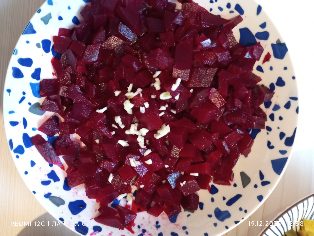 Нарезала бордовый овощ кубиками. Чесночку туда немного меленько покрошила, чеснокодавку уж не стала пачкать, там чесноку-то всего ничего. Мыть потом её, и так мытья у меня вдосталь после готовки. Посудомойки нет у нас.