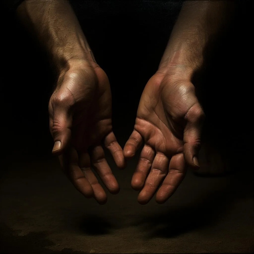 Две руки в полутьме — одна протягивает тёмный острый камень, другая раскрыта ладонью вверх, но не берёт, а лишь касается воздуха под ним. Между ними — легкая дымка, словно граница миров.