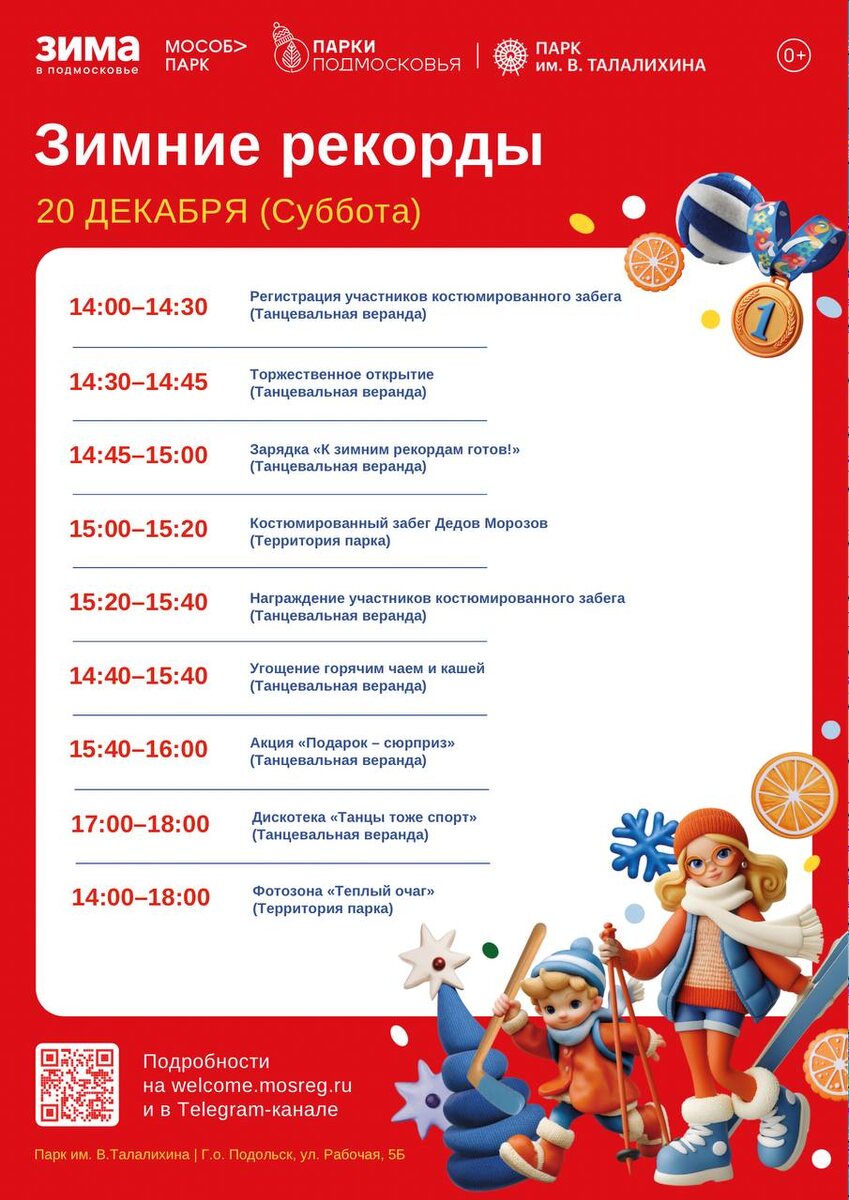 ✨ Фестиваль «Зимние рекорды» в парке им В. Талалихина 🔻14:00-14:30 — Регистрация участников костюмированного забега (Танц веранда); 🔻14:30-14:45 — Торжественное открытие 🔻14:45-15:00 — Зарядка (Танц веранда); 🔻15:00-15:20 — Костюмированный забег Дедов Морозов (Территория парка); 🔻15:20-15:40 — Награждение участников 🔻14:40-15:40 — Чай и каша 🔻15:40-16:00 — Акция «Подарок – сюрприз» 🔻17:00-18:00 — Дискотека «Танцы тоже спорт» 🚫 Возраст: 0+ 📆 20.12.2025 🏢 Парк культуры и отдыха им. В. Талалихина 📍 г. Подольск, ул. Рабочая, 5Б 💰 Вход свободный❗️ ⭐Поддержать канал голосом 🍰Где поесть в Подольске ✅ Мероприятия Подольск https://dzen.ru/id/66ed500f7b5671493eca3fd6 http://vk.com/podolsk_events http://dzen.ru/podolsk_events